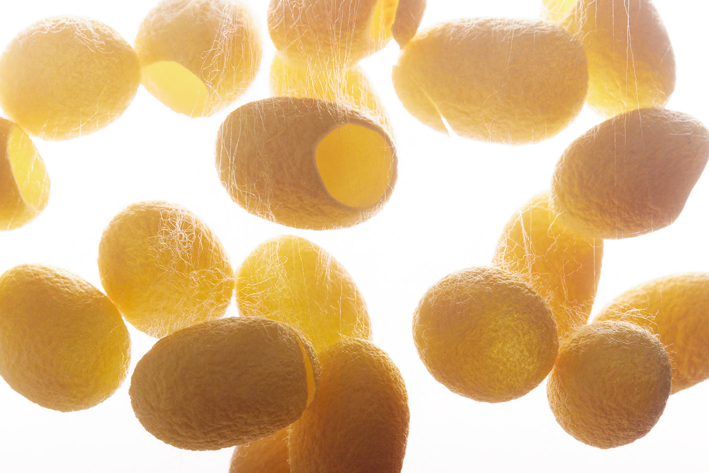 日本国内の限られた養蚕農家と独占契約することで入手できる希少価値の高い(※)天然の金の繭100%で生産しています。